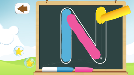 – Writing the letters in the black board with four different colors where you are rewarded with 3 stars if you write the letter correctly, and in case of mistake you can use the eraser.