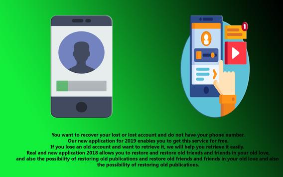 this app offers you the best services in this year 2019 and 2018 without any problems and with very good performance, You want to recover your lost or lost account and you do not have your phone number. Our new app for 2019 allows you to get this service for free. If you lose an old account and want to recover it, we will help you to recover it easily. The actual and new 2018 app allows you to restore and restore old friends and friends in your old love, as well as the ability to restore old publications and restore old jokes and friends in your old love, as well as the possibility of restoring old publications.