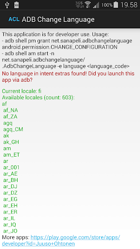 This tool is especially handy for developers who want to add locale switching to (test) automation. Tool works on all the latest public OS versions, verified on Android OS 8.0 (Oreo, Google Pixel XL) 7.0 (Nougat, LG G5), 6.0 (Marshmallow, Nexus 6 and Nexus 9), 5.0 (Lollipop, Nexus 5), 4.4 (Kitkat, Galaxy S5), 4.3, 4.2, 4.1 (Jelly Bean), 4.0 (Ice Cream Sandwich, Asus Transformer tablet).