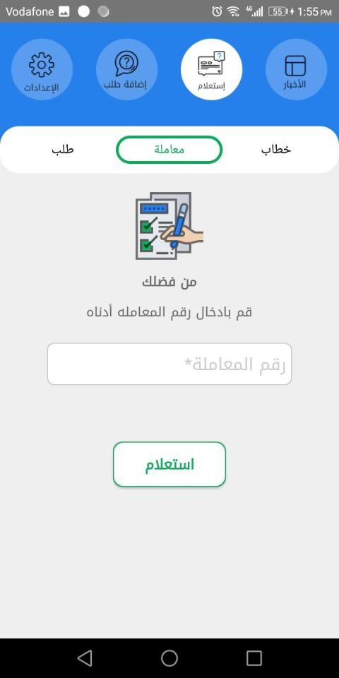 ويوفر امكانيه الاستعلام عن المعاملات بواسطة رقم (الخطاب – طلب – المعاملة ) والاجراءات التى تمت عليها