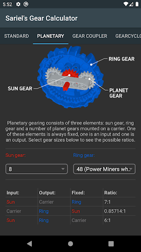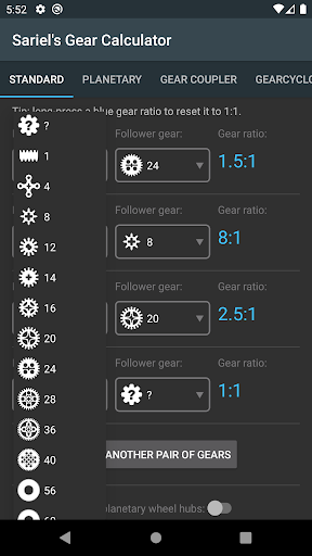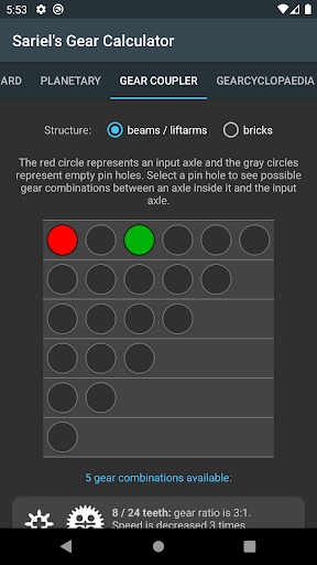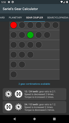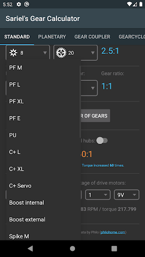 This tool is aimed at all AFOLs. Use it to calculate final ratio of up to 10 pairs of gears, then select the desired type and number of motors to see the theoretical output (speed and torque). Includes 15 sizes of gear wheels and 26 various types of motors! Also included: a planetary ratio calculator, gear coupler for finding available gear combinations at given axle spacing and Gearcyclopaedia featuring detailed info on 38 types of gears. NEW: Combinations finder tab where you can enter a desired gear ratio and the numbers of pairs of gears you want to use, and the app will calculate the solution (exact or the closest possible).