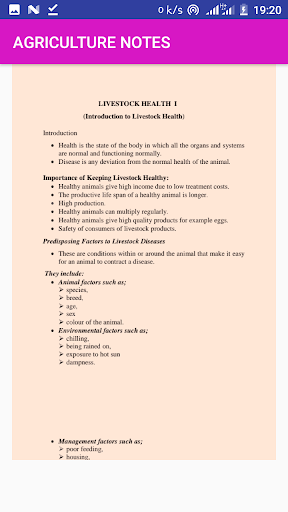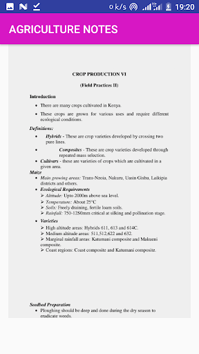 The application offers the secondary agriculture notes starting from form 1 to four 4. The notes are compiled in summary form to enable the user get the content easily.