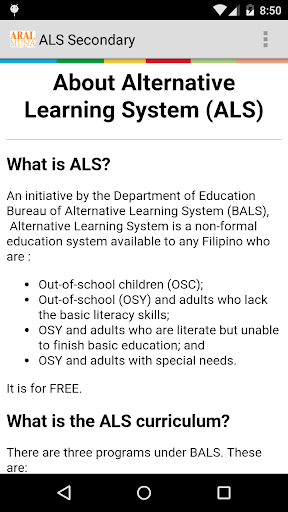 ALS Alternative Learning (HS) is a FREE application containing a collection of lessons, quizzes and other useful information for Department of Education (DepEd) Alternative Learning enrolled students preparing to take the DepEd BALS Accreditation & Equivalency (A&E) Test in the Philippines.