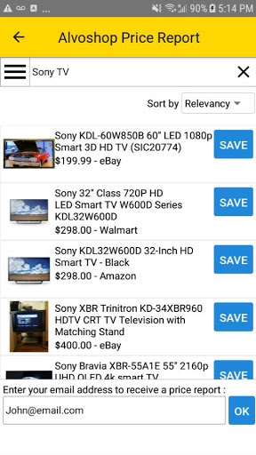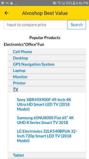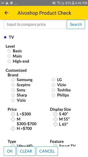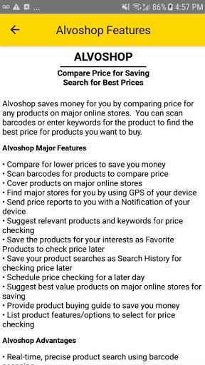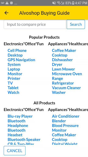 To compare price, you can scan the barcode or enter the product name or keywords to search. A suggestion list for products may show up for you to select. Then Alvoshop will search for relevant products on major online stores to compare price.
