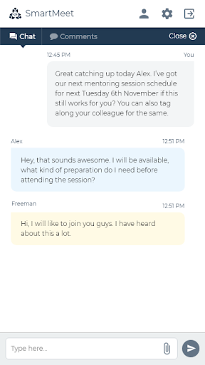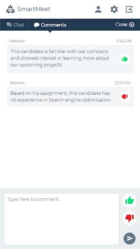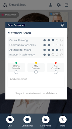 We provide a collaborative environment using audio-video conferencing and chat. Interviewers and candidates can download the app and join interviews using the interview link that they receive.