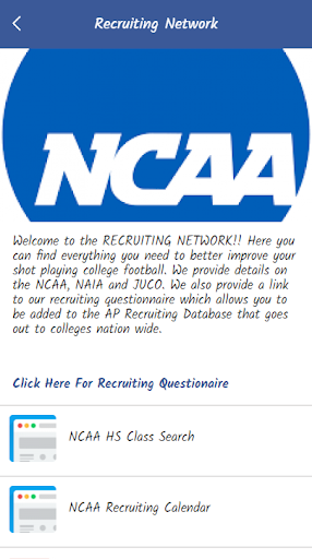 AP Football is designed to assist parents and athletes navigate the recruiting and performance training world. This app is Taylor made to help you find trainers, tutors, and camps across the country. We also provide a free college recruiting service for the High School athletes. If you are a parent or football player this is easily the perfect app for you!!! We will be updating our network of trainers and tutors monthly!!!