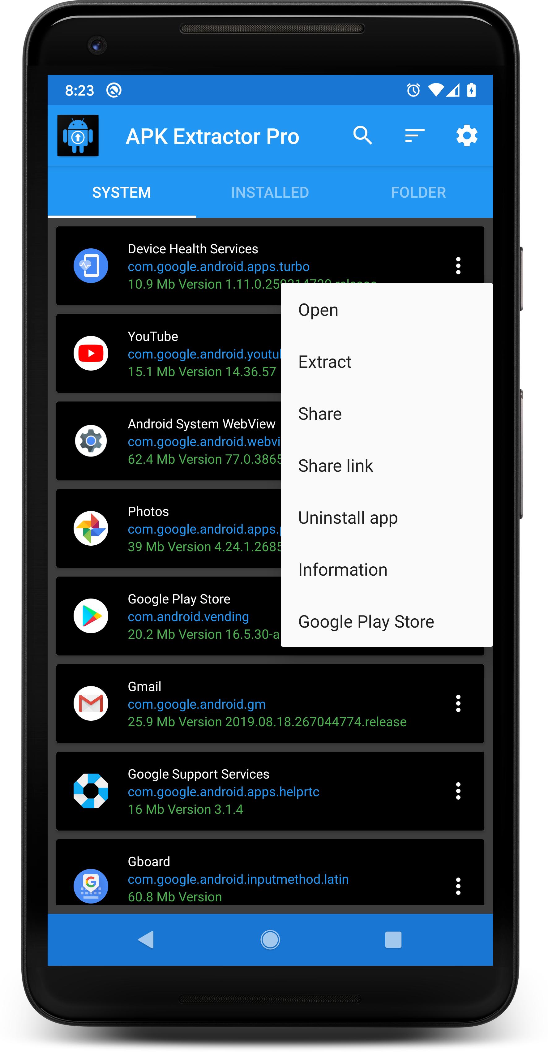 This application helps you to extract installed applications and generate an APK file on your device so you can share in Gmail, Dropbox, Google Drive..