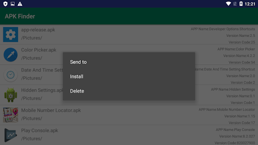 It auto search apk file in your external storage and list it on the screen,you can do some operator with apk file,such as send the apk file to some body or some device,install the apk file,delete the apk file.