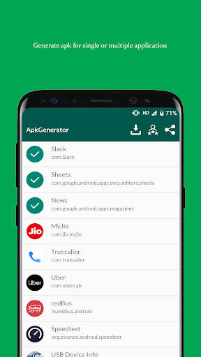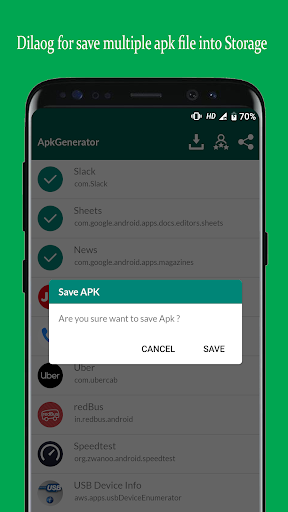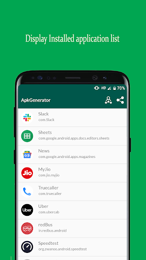 APK Creator is generating or extracting application from installed application list. APK Creator is also save generated APK into internal storage. User can see all saved APK file inside APK Creator application and also install APK file ovre there.