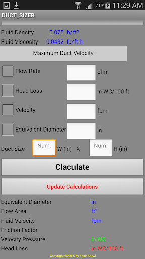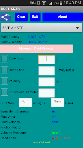 DUCT SIZER : YOU CAN CHECK YOUR MAX VELOCITY IN EASY AND FAST WAY .BY ENTER TWO INPUT YOU CAN GET ALL INFORMATION REQUIRED TO COMPLETE YOUR DUCT DESIGN.YOU CAN USE DESCRIPTION HOW TO USE THIS APP. BY PRESS ABOUT BUTTON THEN DESCRIPTION OF USE.YOU CAN CHANGE BETWEEN ANY TWO VARIABLES (FLOW RATE,VELOCITY,HEAD LOSS AND EQUIVALENT DIAMETER ) TO GET OTHERS.IF YOU LIKE CHANGE HEIGHT OF DUCT YOU ABLE TO SEE PRESSURE HEAD LOSS AND VELOCITY CHANGE BY PRESS UPDATE CALCULATION BUTTON.