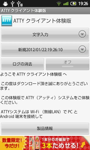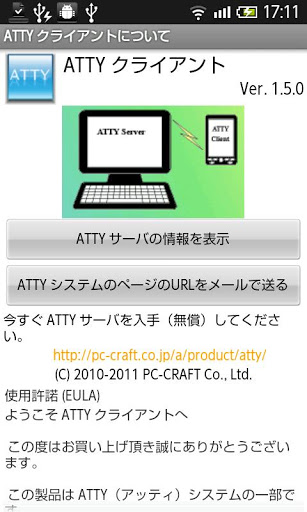 You can control android devices from PC via wifi http:pccraft.co.jpattyATTY System realize to control Android devices from PC via WiFi or wired LAN.ATTY is made in Japan.ATTY designed for helps Customer supporter of Android market, app amp; web site developer and expert users.This is teletype service.Launch app.Send some key, text, files.Publish intents,etc. http:pccraft.co.jpattyThere is a product version. Supported devices.Any OS 1.6 OS 4.0 ICS devices. Confirmed devices. docomo HT03AXperia SO10Bgalaxy S SC02BREGZA Phone T01CLYNX 3D SH03COptimus PAD L06CXperia acro SO02CGALAXY S II SC02CXperiaTM ray SO03CGALAXY Tab 10.1 LTE SC01DMEDIAS WP N06CMEDIAS N04C Au IS01IS03IS06 SoftBank GALAPAGOS 003SHLibero 003Z Camangi FM600 NEC Smartia LifeTouchTrial Version LimitationDifferences of product version.show some ads. Can39;t connect multi clients at a time. Display limit max 10 installed apps.
