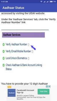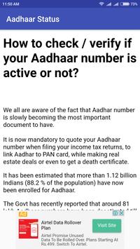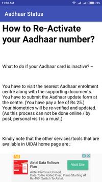 The Aadhaar Status is a mobile application which is so designed to get the current status of Aadhaar by providing the 14 digit enrolment number . The application works in offline mode and standard SMS rates are applicable for accessing the service.