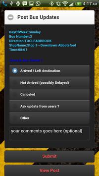 Abbotsford BC Bus Transit application helps find bus timing for the city of Abbotsford and Mission in British Columbia. See transit routes on a map and find the bus timings with the fewest of clicks. This application has a special feature that allows users to post or view updates about a bus real time when in transit. This is an alternate strategy to GPS tracking.