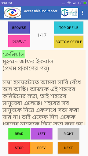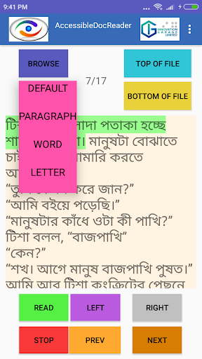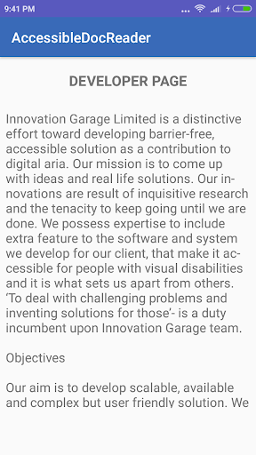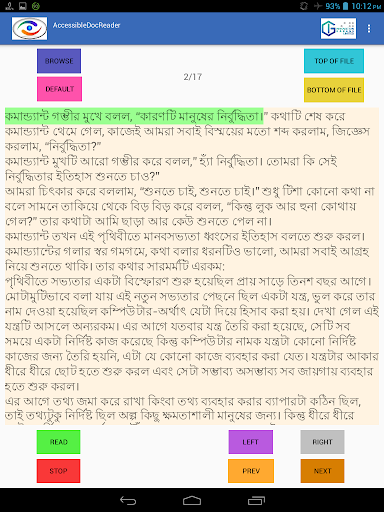 Accessible Doc Reader overcomes a previously insurmountable problem for people with a visual impairment who want to read and work with doc, rtf and text files in Bangla and English language.