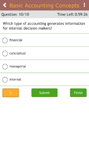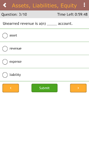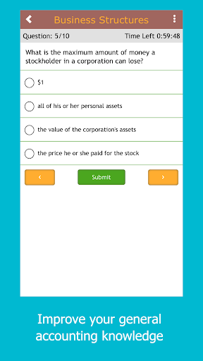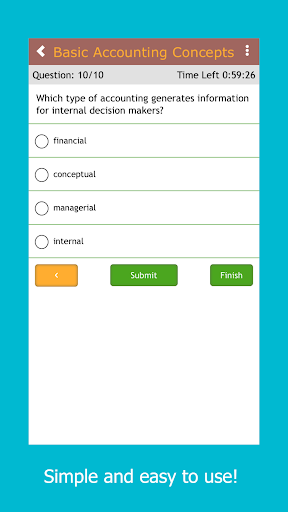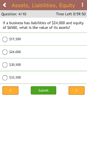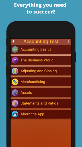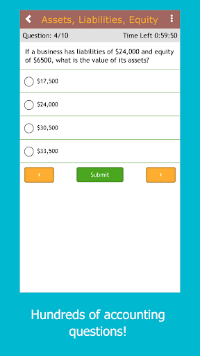 Study accounting with these practice questions. This simple study app contains hundreds of accounting questions, broken down into short, targeted quizzes. The app contains hundreds of questions on all the major accounting concepts, from double-entry bookkeeping to basic financial ratios. It is a quick and easy way to study for an accounting test or simply to improve your accounting skills.