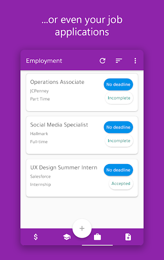 Acsept allows you to keep track of your scholarships, colleges, jobs, and other application forms so that you will never miss any career opportunities again.