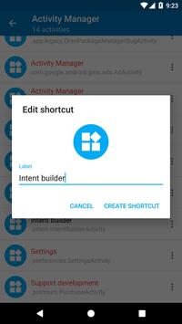 - compose and run any intent with arbitrary parameters. Activity Manager supports all available Intent parameters: package and class name, action, data and mime type, extra bundle parameters, categories and flags. There a list with history of launched intents with ability to create Intent shortcut or export Intent as URI string.