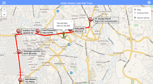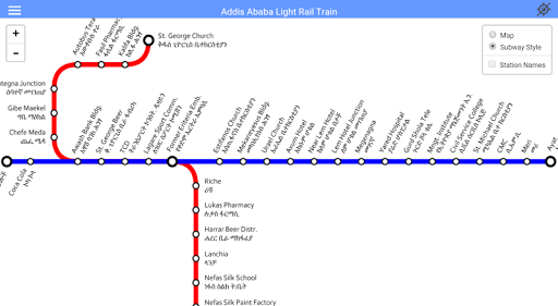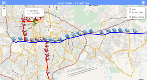 Addis Train is a helper app for the Addis Ababa Light Rail Train network. It provides the user with a subway style map of the train network or a map of the rail network overlaid on an actual map of Addis Ababa.
