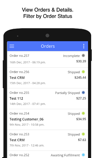 Orders: View list of orders (latest first) or drill down into specific order to view value, items ordered, billing & shipping address, staff notes, customer comments and full details of the customer. You can filter orders by status, search any order by ID, change status of any particular order or add staff notes. Additionally, you can view/add shipment & tracking info for any order. Abandoned carts are also available as 'Incomplete Orders'. Staff notes can be added through the app. (In-app product: $0.99/month subscription)
