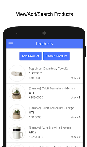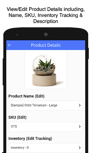 Products: View list of products or search any product using SKU or name. View/Edit any product detail including product images, inventory level, price, SKU or description. Images can be uploaded right from your mobile picture gallery or camera. You can also create and add new products through the app. (In-app product: $3.99/month subscription)