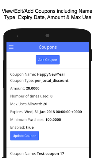 Coupons: View/Edit all active/inactive coupons at your storefront. Coupon details include coupon type, value, description and validity dates. New coupons can also be created on the fly. (In-app product: $2.99/month subscription)