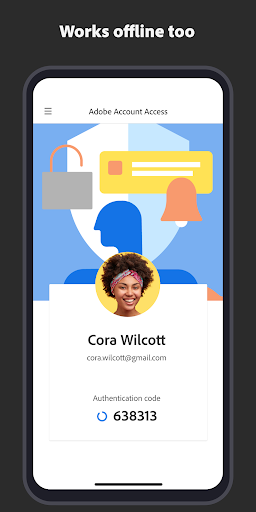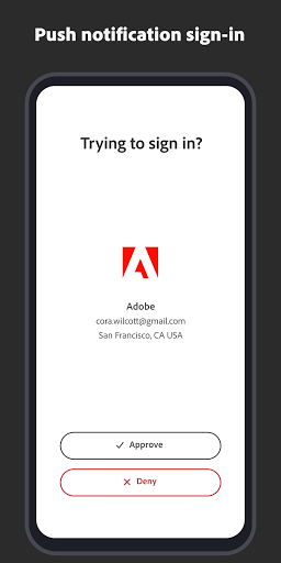 Use Adobe Account Access to sign in with a tap. Each time you need to sign in to your Adobe account, this app will receive a push notification. Approve it, and you're signed in! It's fast, convenient, and secure.