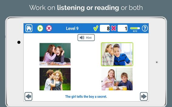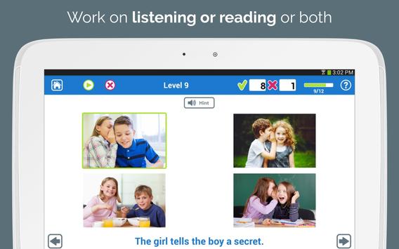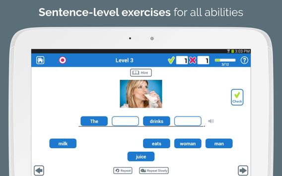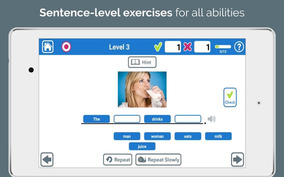 a sentence by focusing on each word & how they all fit together. Arrange the words one-by-one to match the pictured sentence you hear. Start with 3 words and work up to 9.