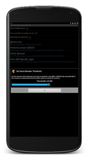 Game Booster: Boost your game performance by killing other background processes when your game is running. Select the amount of free memory you want to maintain and then select the game to boost the performance. Advanced task killer will maintain this free memory for you by killing other background tasks.