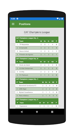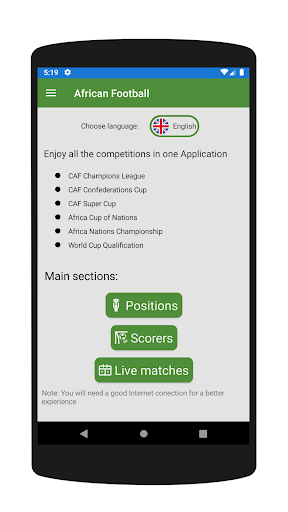 This application of African football will allow you to follow live all the matches of the most relevant competitions. You can follow the international football matches of Africa at club and country level. In addition, all relevant information is provided to the competition: positions, results, fixture, scorers and more.