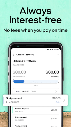 • Payment plan: pay the first installment straight away - then the remainder every every two weeks. Remember - it's interest-free, and no late fees when you pay on time.