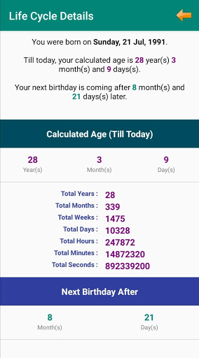 ► Find out your total life cycle in year, month, day, hour, min and in sec.