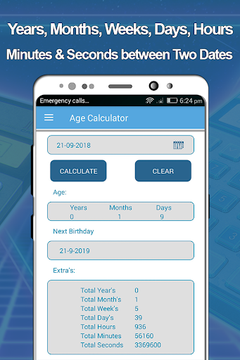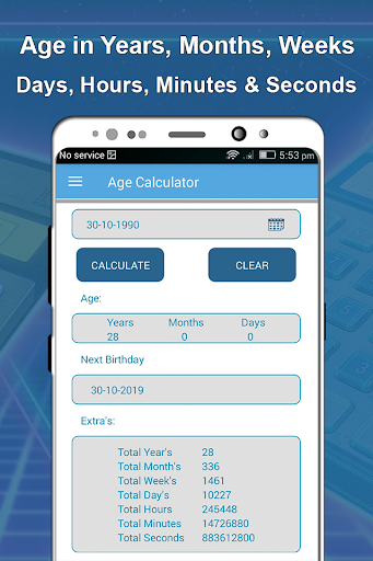 Download this age calculator and birthday counter app now and find out how old are you. You can find answer to how old am I question in the form of number of years, number of months, number of days and number of hours that you have lived.