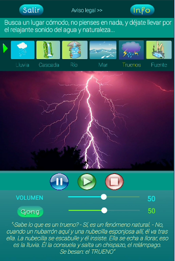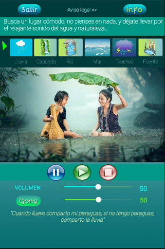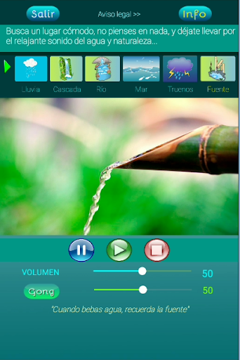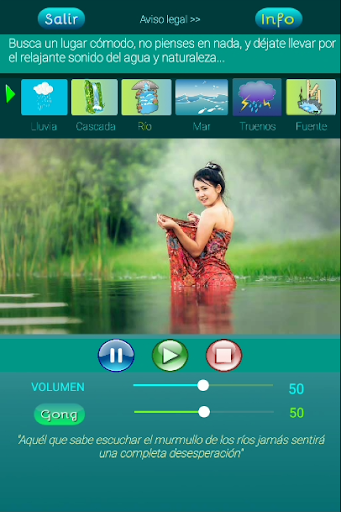 Ta aplikacja pomoże Ci, niezależnie od tego, czy jesteś zestresowany, czy nie, czuć się dobrze o sobie, poczuć spokój i spokoju w swoim życiu, a te chwile relaksu będą jak wstrzyknięcie witaminy C, która pomoże Kontynuujesz i śledzisz swój dzień na dzień lepszy, codzienne życie. Istnieje sześć środowisk natury, gdzie woda jest głównym bohaterem, w którym zawsze, ponieważ się rodzimy, poczuliśmy niezrównany pokój.
