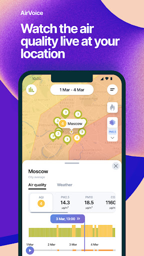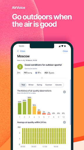 In AirVoice app you'll find you'll find minute-by-minute updates on air quality from a network of professional monitoring stations. Use it to make important health decisions every day - whether to open windows, play outdoor sports or take your child for a walk.