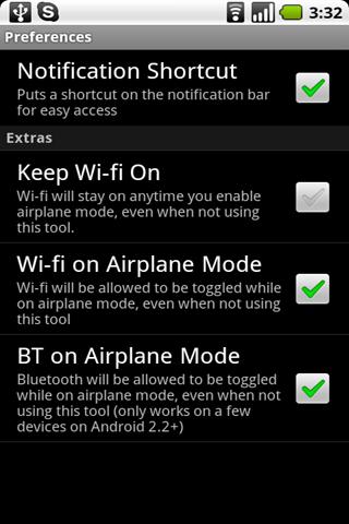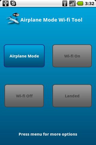 This tool will help you manage your android phone to connect to wifi networks Wireless Internet, or Wifi while on Airplane Mode.Very easy to use, simply press the buttons as they get active.1 Before take off, turn on airplane mode by pressing the quot;Airplane Modequot; button. This will also enable the Wifi On button for later use Your Wifi and bluetooth will also be disabled, for now2 When Wifi is allowd to be used, use the quot;Wifi Onquot; button to turn on wifi, this will also open the wifi settings to connect to the airplane network39;s SSID. Some airlines require you to register or login, so make sure you go into the browser and follow directions before opening any other aplication since they might not work right away.3 When announced that wifi usage should stop, use the quot;Wifi Offquot; button to turn wifi off.4 After landing, use the quot;Landedquot; button to turn airplande mode off. This will turn airplane mode off and reenable your phone usage as normal.This tool works with any version of Android, including 2.0, however, it is only necessary if you have a device with Android 1.51.6. Android 2.0 allows Wifi to be toggled while on AP Mode.Open the preferences and you will find some extras. These extra features will allow you to modify the system so that when you enable airplane mode, wifibluetooth stay on, and, are toggleable.Bluetooth on Airplande Mode only works if your device is on Android 2.2 AND the device manufacturer allows it.This application is free, and if you like it and would like to support me, you can scroll down and click on quot;View more applications by this developerquot;, buy one of my paid apps. Also, this application has a builtin ability to send me donations via PayPal, you are NOT required to do so, but anything is greatly appreciated it and I will take it as a reason to keep supporting this application and trying to get the best out of your phone.