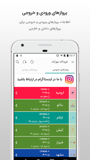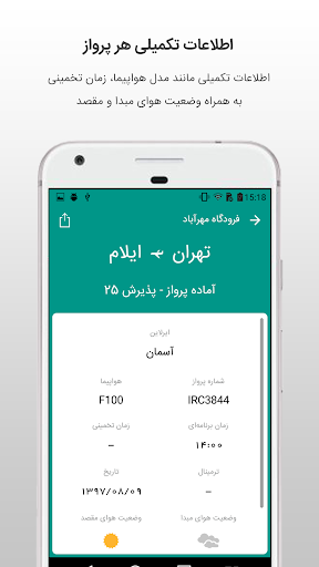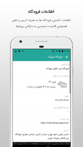 Airports Flight Information app bring you the flight status of Mehrabad, Imam Khomeini, Mashhad, Shiraz, Esfahan, Kish, Qeshm, Tabriz, Ahvaz, Bandar Abas, Rasht, Yazd, Zahedan, Kermanshah, Urmia, Abadan and Gorgan Airport. Also you can find about more info such as estimated time, terminal number and aircraft type.