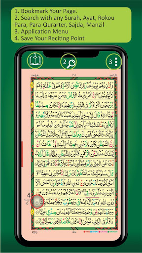You can search The Noble Quran by Parah, Surah, and Ayat (ayah) and learn The Quran Tajweed in easy way. In Quran Taj Company 15 Lines, you can also save your Surah or page with unlimited bookmarks. While reciting The Holy Quran just tap the bookmark icon in quick toolbar to save the current Quran page plus you can search for particular ayah inside the application.
