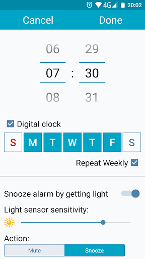 Alarm clock for android, great design and ease of use. You can turn off or postpone the alarm clock by turning on the room light, shaking the phone and other options. Select an mp3 or music file as alarm tone, use the camera flash light to wake you up before the alarm starts ringing and many other features.