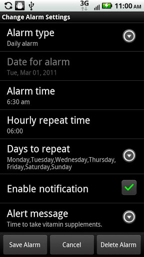 -Option to repeat alarm on hourly/minute basis after the alarm first came due. For example, use this as a snooze feature.