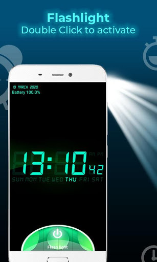 Turn flashlight in emergency simply by clicking double tap on mobile screen inside alarm clock free app. This is amazing tool to turn ON AND OFF your phone’s flashlight with taping.