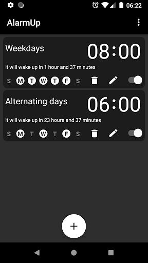 Also keep in mind the only alternate-day alarm available on the Play Store. With this feature your alarms will automatically set to wake up every other day, no need to be resetting the alarm every week, just set once and you're done, it will automatically update the days every day you wake up.