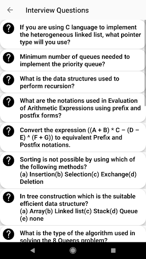 The app is a complete free handbook of Data Structure and Algorithms which covers important topics,programs & some Interviews questions and they also have online quiz to make a skills better and quick revision.