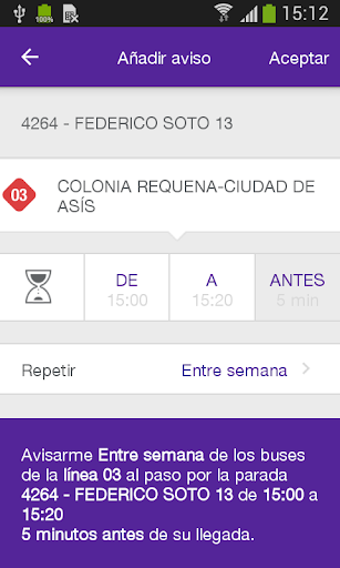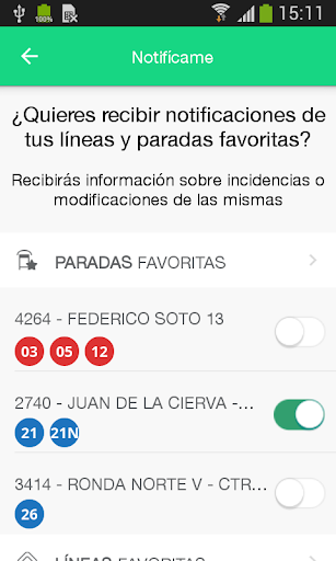 Notifícame: Activar notificaciones generales del servicio, como cambios de horarios o incidencias, para cada una de las paradas y líneas marcadas como favoritas.