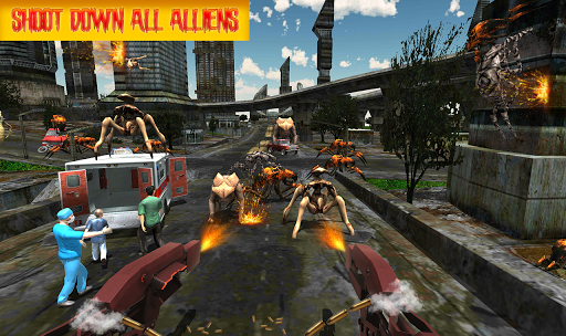 The game features multiple levels. You will have to face new challenges in each level that will make the gameplay more fun and exciting. Each level will have aliens invading different parts of the city that you will have to rescue from aliens. Shooter will have the state of art guns to kill the aliens.