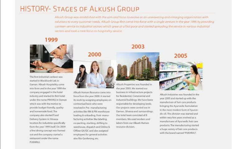 Established in 1996, Alkush Group is one of the most diversified companies in India today. With a unique combination of products & services it offers a world class range of consumer & institutional products. Over these years, Alkush Group has spread its business in various sectors including Industries, Hospitality, Human Resource & Properties.