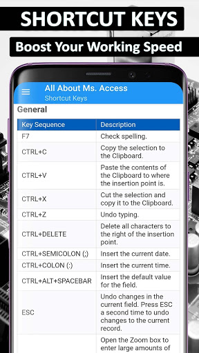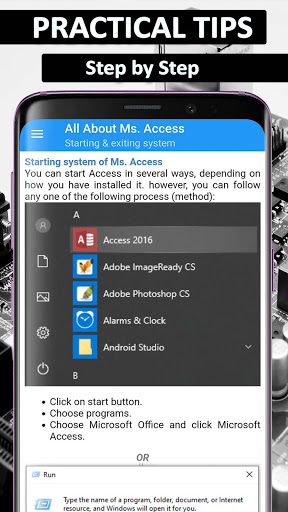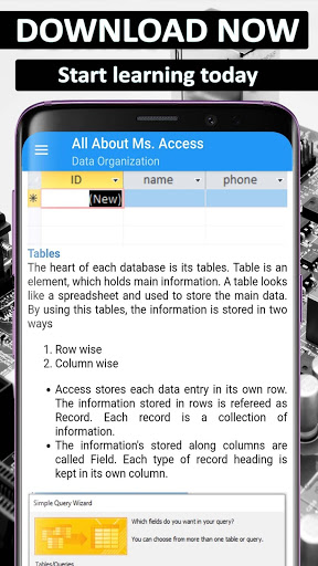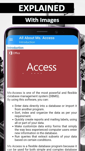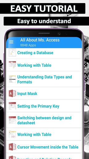 This app is all about ms access, you will learn Data organization. Table, Queries, Forms, Reports, Pages, Macros, Modules. Ms-access course will guide you from basic opening MS Access to Logical Formulas. Everything is explained step by step, which makes it easy to understand.