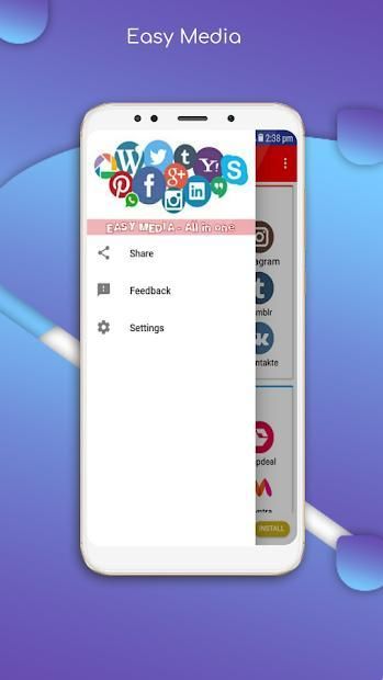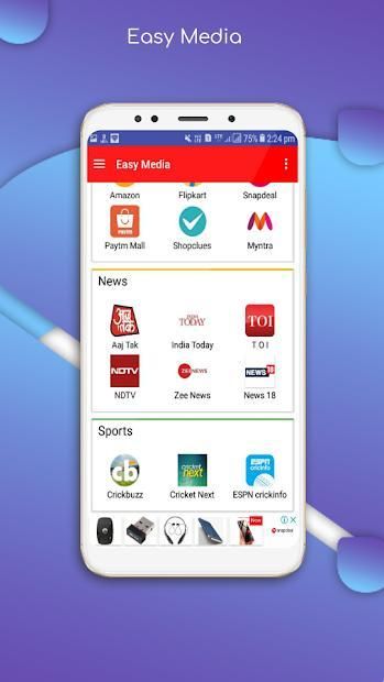 Easy Media is an application that provide an easy access to all social networks, Shopping, News & Sports sites namely: Youtube, Facebook, Twitter, Instagram, Google +, Pinterest , Amazon, Flipkart, Aaj Tak, NDTV, News18, Crickbuzz & many others