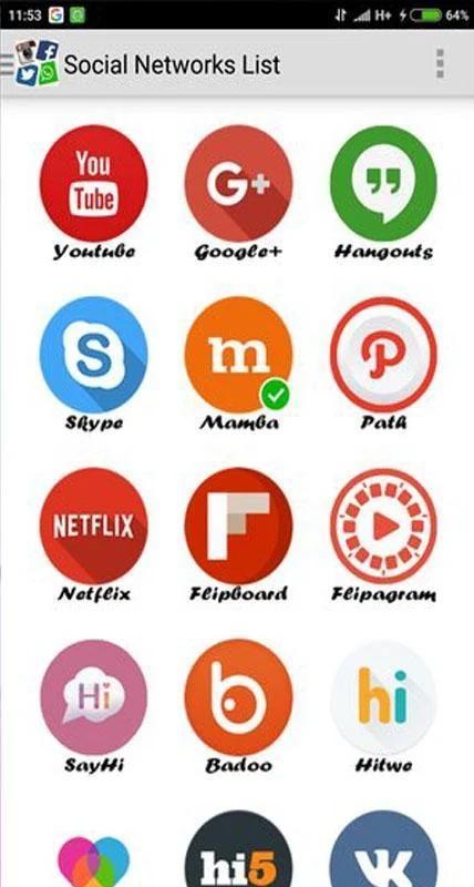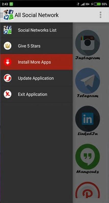 All Social Network is an application that groups and provide an easy access to all social networks namely: Facebook, Twitter, Instagram, Snapchat, WhatsApp, Messenger, Telegram, Pinterest, Snapchat, Linkedl, Youtube, Hangouts, Skype, mamba, Path, Netflix, Flipagram, Flipboard, Sayhi, Badoo, Hitwe, Lovoo, Hi, VK, Tagged, Viber, Line, Tango, Meetme, Meetup, WeChat, Bip, Okcupid, ZapChat, Flickr, Tinder Foursquare, Twoo, WeHeartit, Azar, Quora, Topface, DeviantArt, Flirch, Moco, Waplog, Lovely, Zoosk, Jauma, Askfm, Hoott, Yahoo, Gmail, Outook, Periscope, Tumblr, HipChat, Wayn, Xing, Cyworld… and more