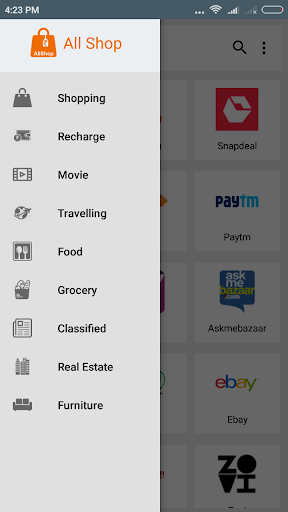 • All In One Shopping App Provids List of all website which needs in routine life like Shopping, Recharge, Movie, Traveling, Food, Grocery, Classified, Real Estate and Furniture