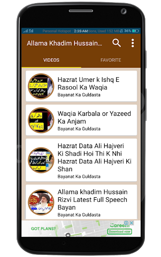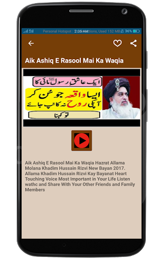 In this APP you will find most watching and Listening videos for Beautiful and Heart touching Bayans. Our database consist of Urdu Bayans. We have gathered some excellent videos in HD quality for all Bayan Sherif lovers.Watch and listen Molvi like Allama Khadim Hussain Rizvi Bayan on your smartphone with single tap.Khadim Hussain Rizvi ia a well Known Islamic Scholar.He is preaching the lesson of Holy Quran and Muhammad Laws -Seerat-e-Muhammadi- in all over the Pakistan by.